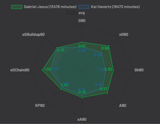 As mentioned, it is quite hard to lock Jesus down to a certain position or role due to his flexibility and technical ability. Throughout a game he roams across the front three interchanging with other players to create a huge problem for defenders. Often, he will drop into or behind the midfield to pick up the ball to start the attacks himself, however the problem then occurs of who will finish the attacks? Below is a graph comparing his overall game stats to Kai Havertz, who has also been known for interchanging positions. It is clear to see how well-rounded Gabriel Jesus is due to his potent threat in different areas.