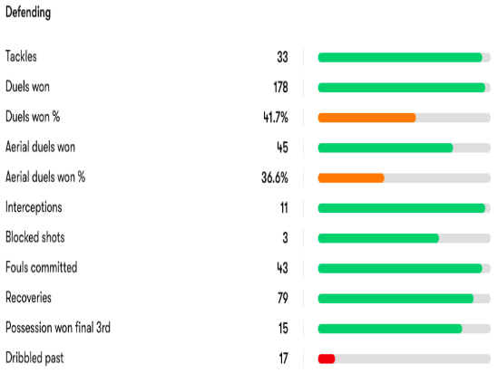 One thing any arsenal fan can’t complain of when it comes to Gabreil Jesus it’s his work effort for the team. His pressing ability is second to none, and more than often he will track back when possession is lost. The stats below look good for a central defender to never mind an attacker; he brings work effort and resilience to the team which lifts everyone around him. His defensive stats compared to Gabriel Martinelli really put into perspective how much he works for the team.