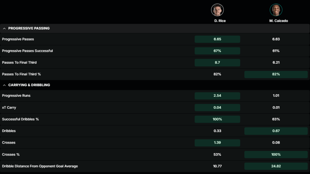 With Arsenal facing Chelsea at Standford Bridge this coming Sunday it is only right to look into the midfield battle of Declan Rice and Moisés Caicedo, as they are two of the Premier League’s finest. They bring very different strengths to their teams. Rice gives Arsenal power, control, and calmness on the ball, while Caicedo offers Chelsea energy, speed, and aggressive ball-winning. Comparing them shows how each player fits their team’s style and what they each bring to the role. In this piece I will look into the stats behind their starts to the 25/26 season.