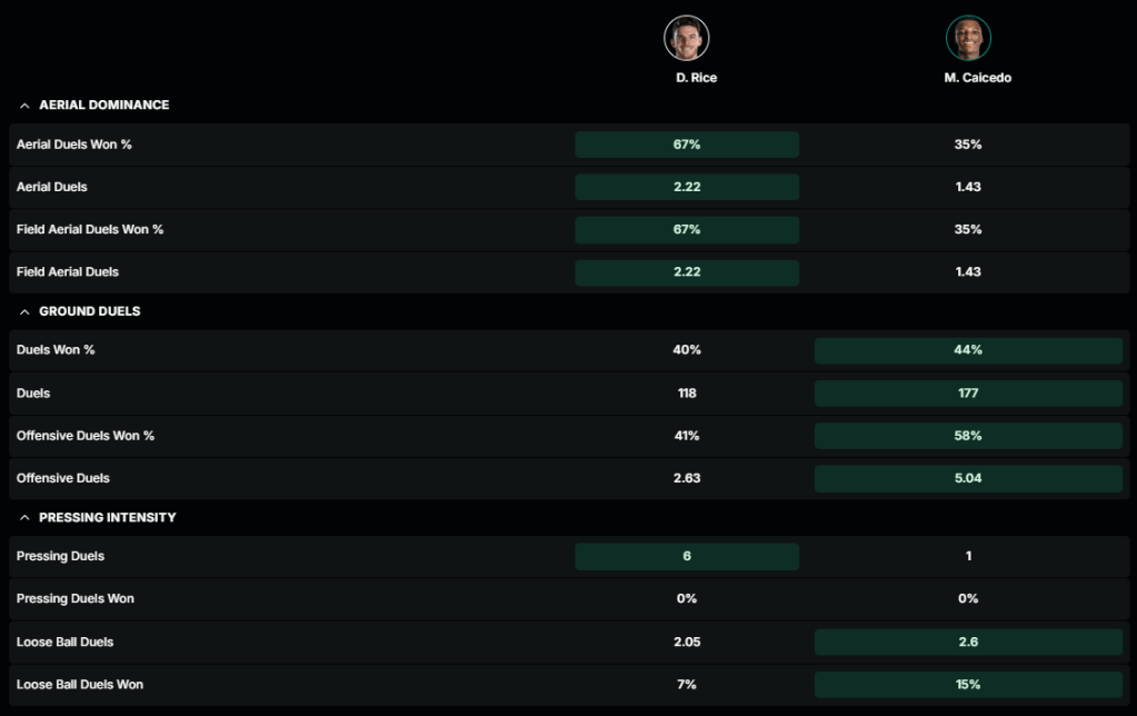 Both are excellent defensively, but Rice defends with patience and control, while Caicedo defends with speed and pressure. When looking at their defensive duties, it is no surprise to see Declan dominating the aerial side of duels due to his increased height. Rice winning 67% of aerial duels compared to Caicedo’s 35%. When it comes to ground duels Caicedo has battled in 177 duels across the season with Rice only managing 118, however it is interesting to see the duel’s won percentage is only 4% difference with Caicedo pipping Rice by winning 44% of his ground duels. When watching Declan Rice for Arsenal he is often one of the first to engage the opposition when they build up from the back and this is seen by his average of 6 pressing duels per 90 compared to Caicedo’s 1.